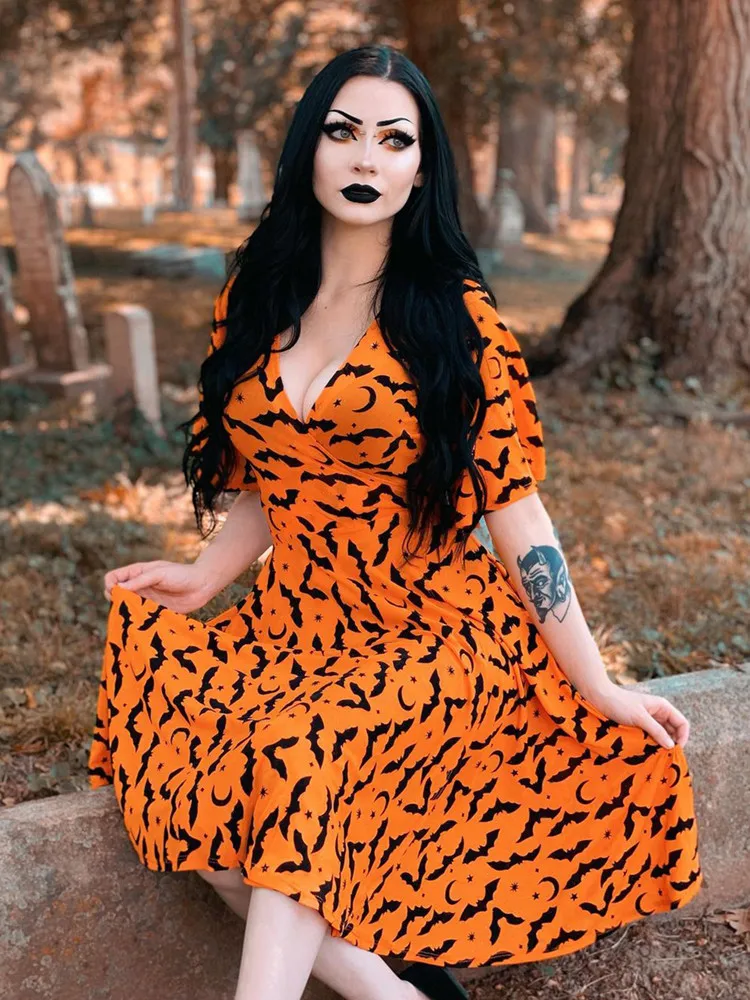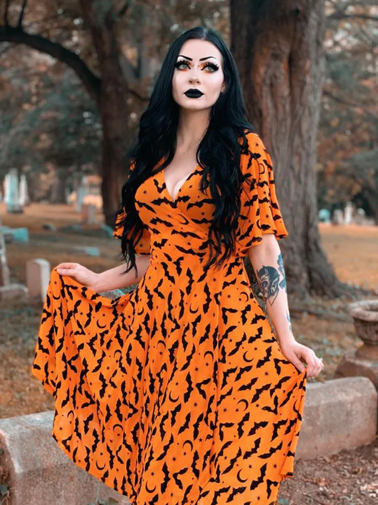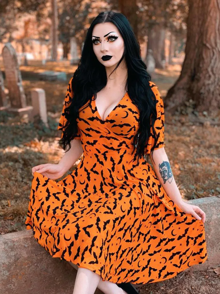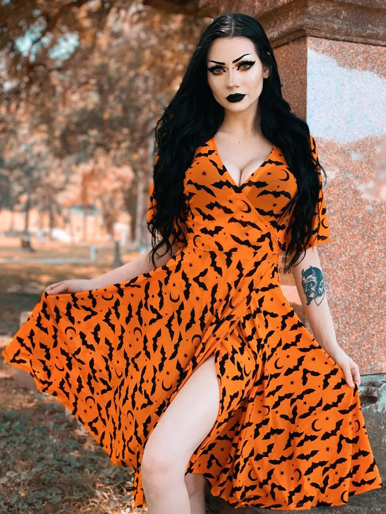 Orange Deep V-neck Fairy Grunge Dress Women Mall Gothic Aesthetics Elegant Bat Pattern Split Sexy Dress