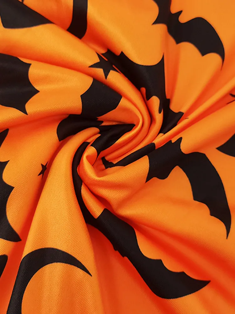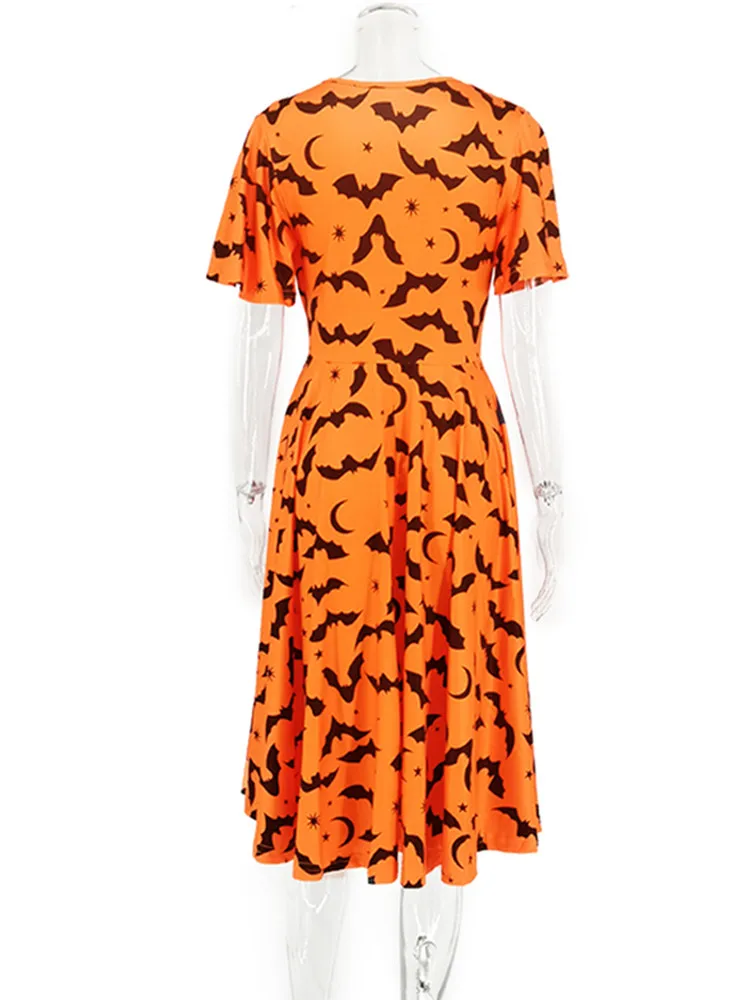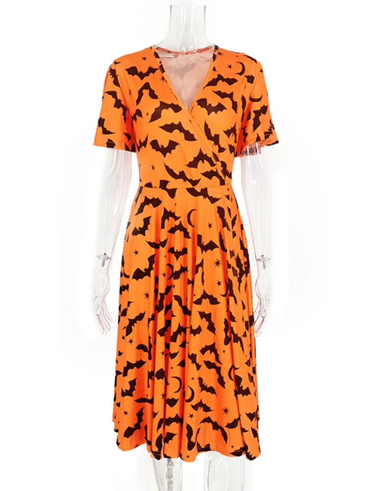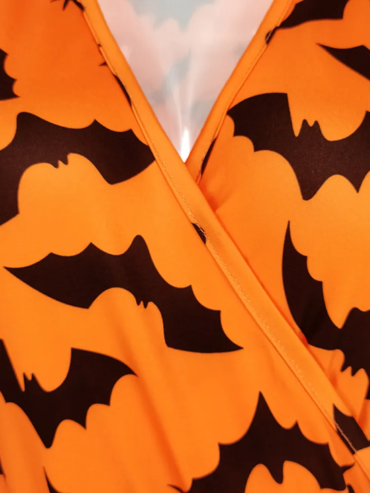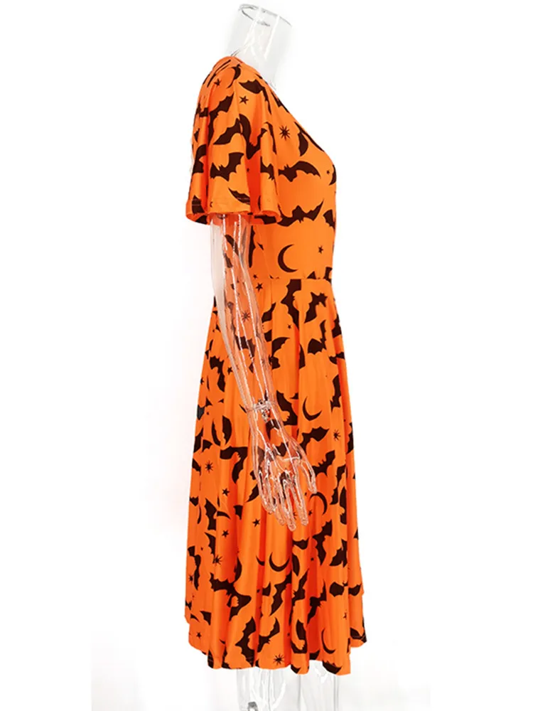 Orange Deep V-neck Fairy Grunge Dress Women Mall Gothic Aesthetics Elegant Bat Pattern Split Sexy Dress