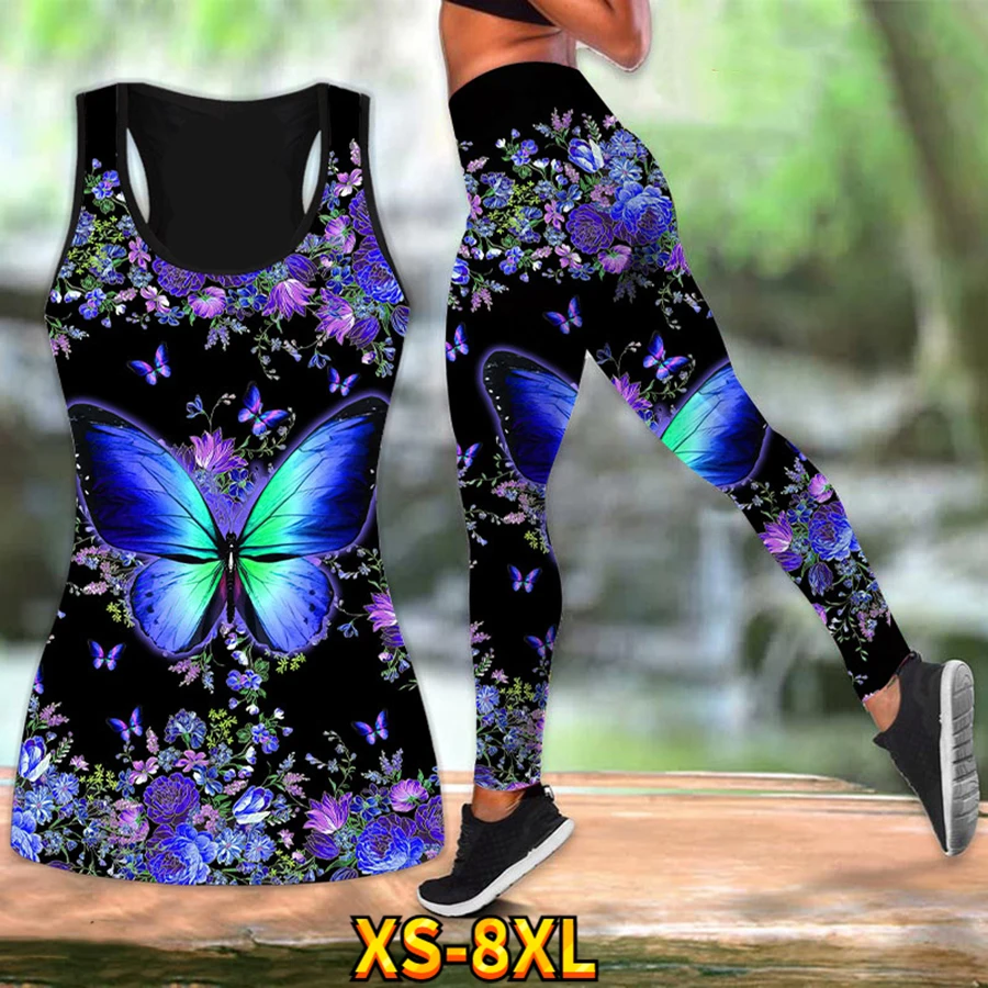 Women Summer Vest Butterfly Pattern Yoga Pants Colorful Pattern Body Sculpting Buttocks Running Set XS-8XL